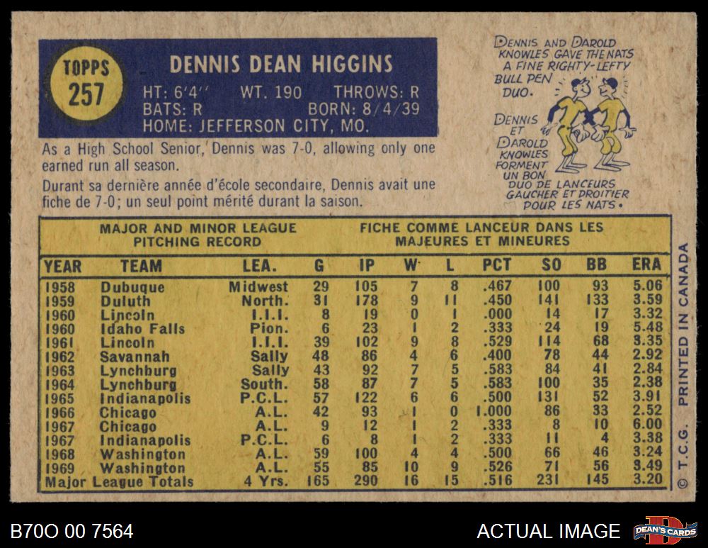 1970 O-Pee-Chee #257 Dennis Higgins 6 - EX/MT