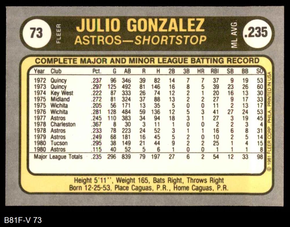 1981 Fleer #73 Julio Gonzalez 8 - NM/MT