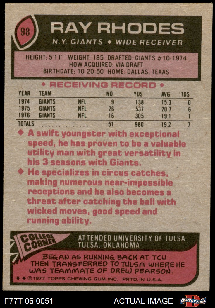 1977 Topps #98 Ray Rhodes 6 - EX/MT