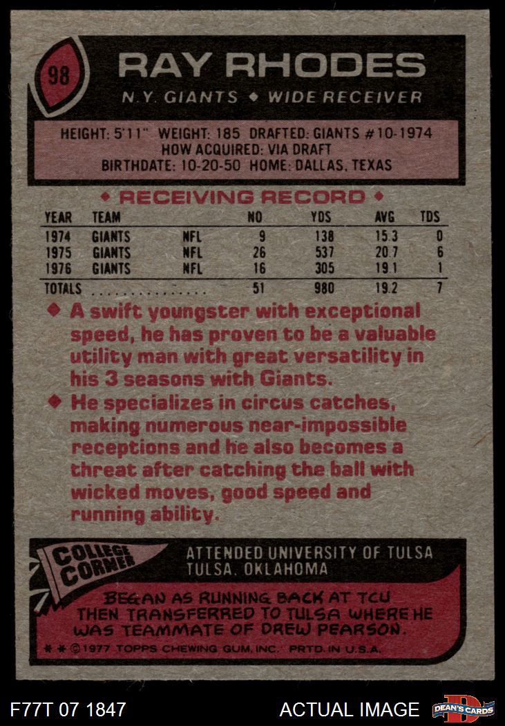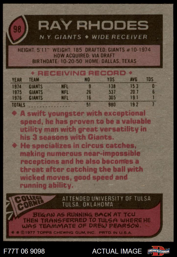 1977 Topps #98 Ray Rhodes 7 - NM
