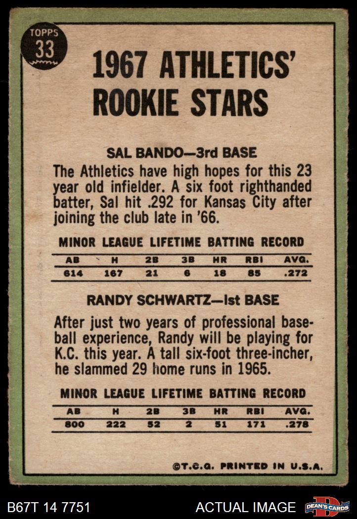 1967 Topps #33 - Sal Bando / Randy Schwartz Athletics Rookies 1 - POOR