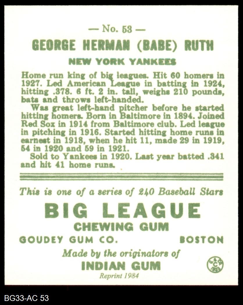 1933 Goudey Reprint #53 Babe Ruth 8 - NM/MT