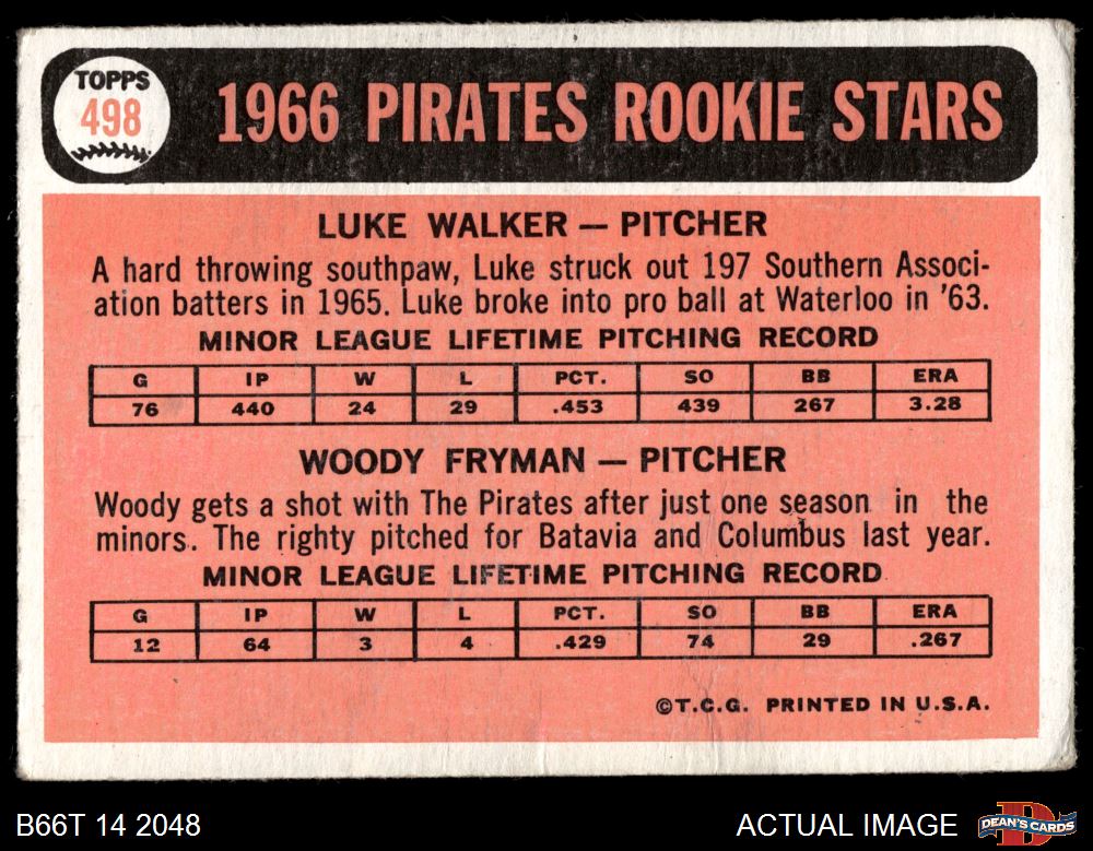1966 Topps #498 - Woody Fryman / Luke Walker Pirates Rookies 1.5 - FAIR