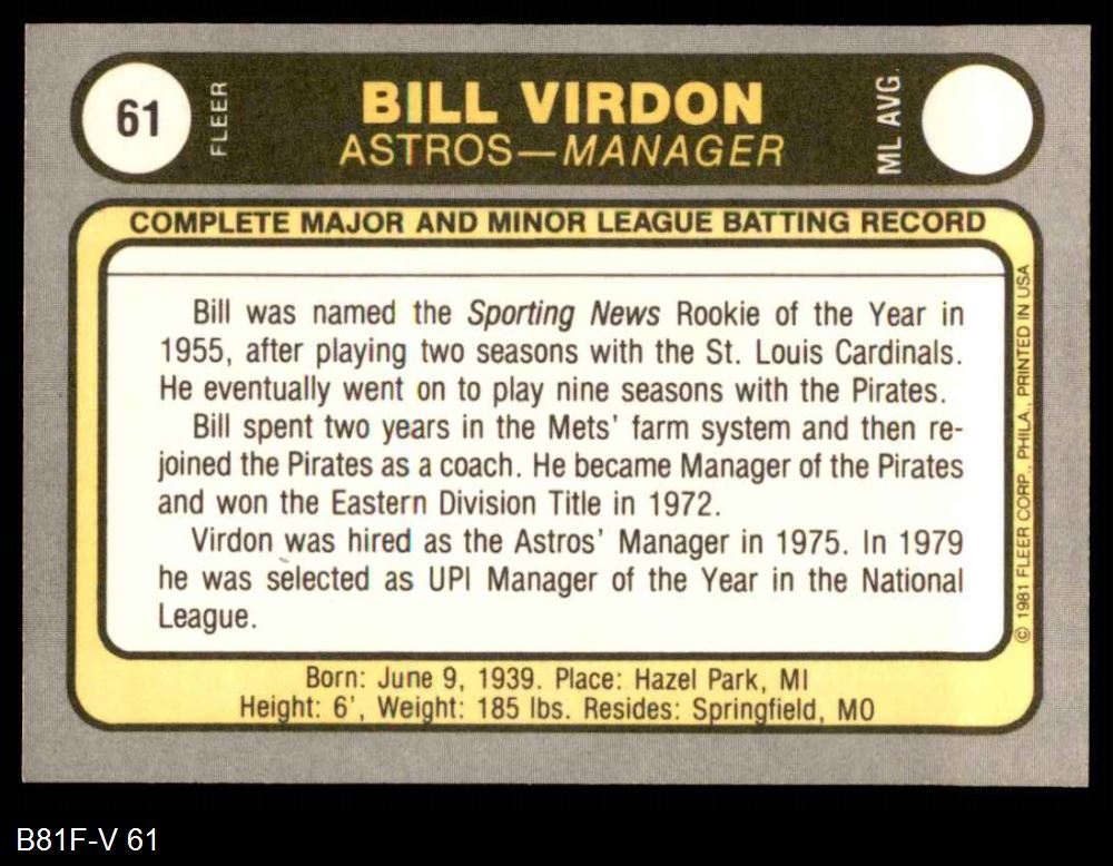 1981 Fleer #61 Bill Virdon