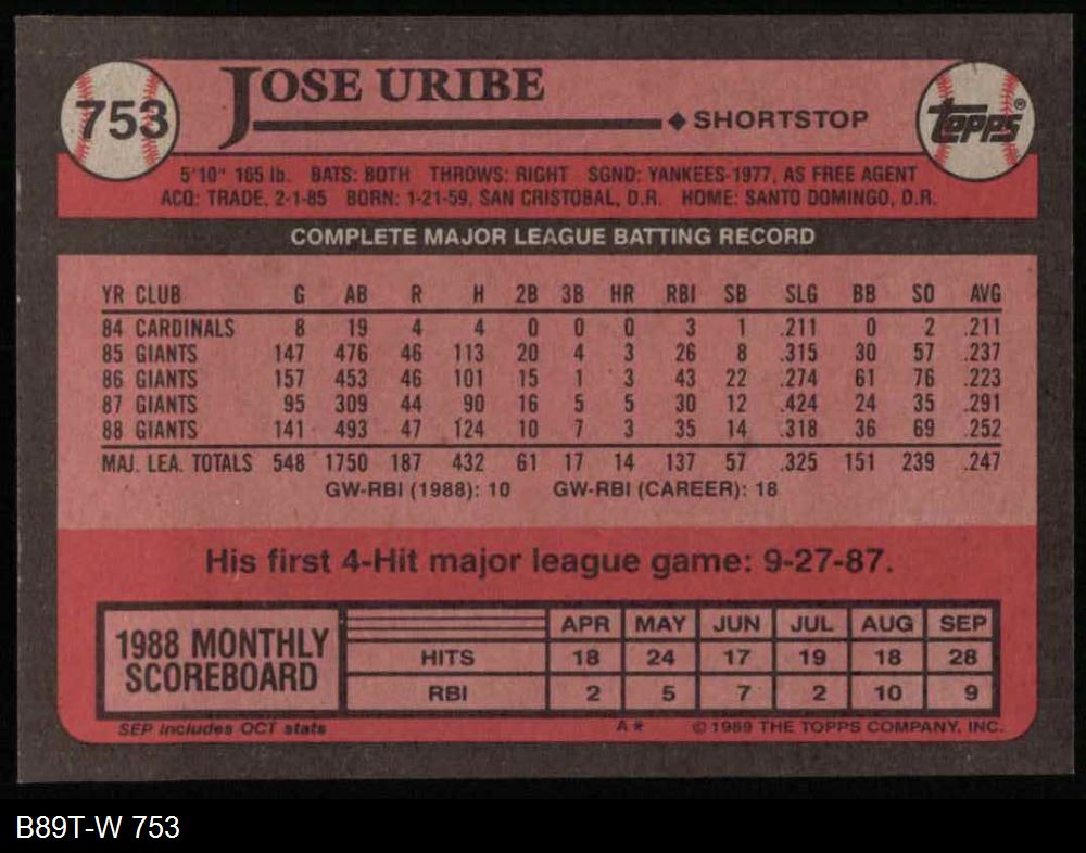 1989 Topps #753 Jose Uribe 8 - NM/MT