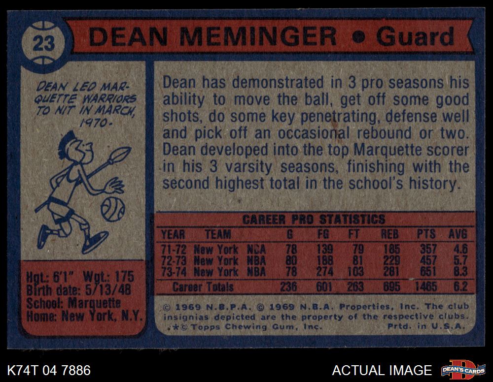 1974 Topps #23 Dean Meminger 7 - NM