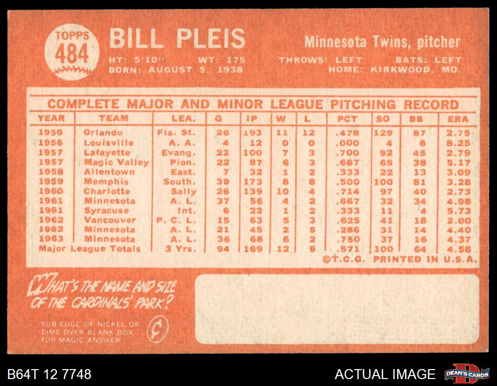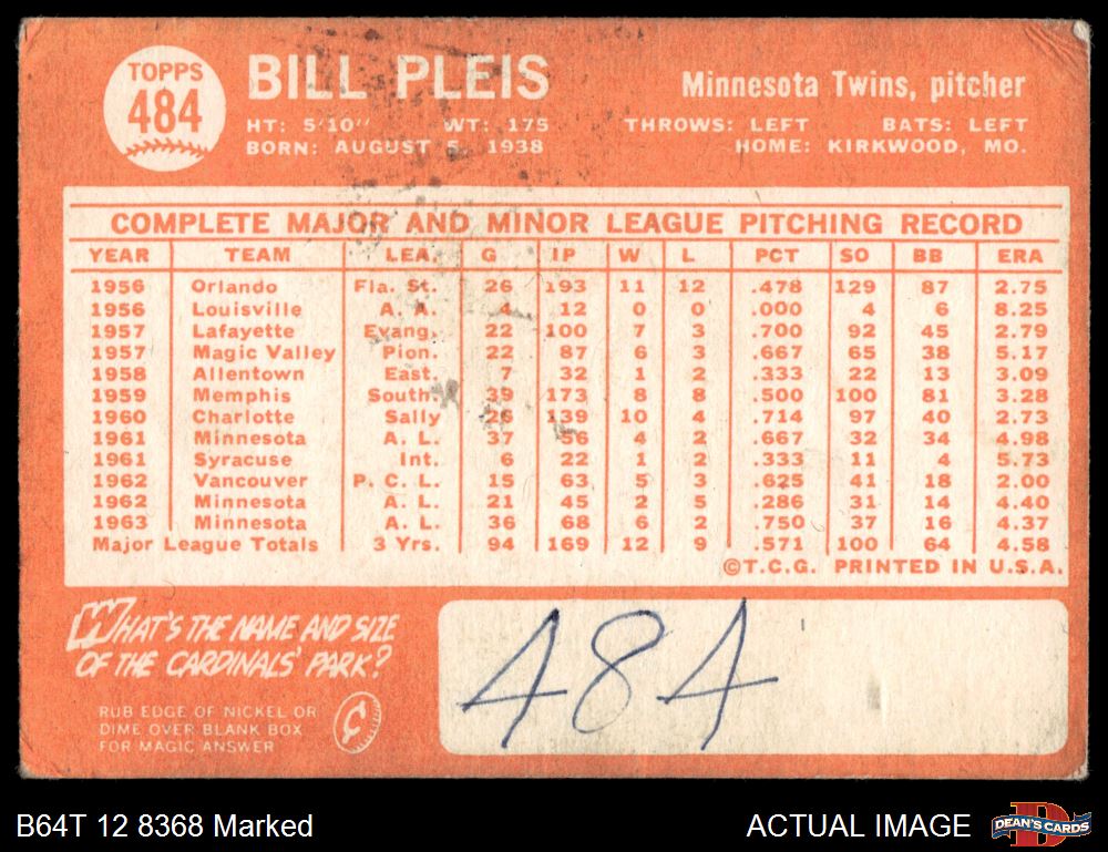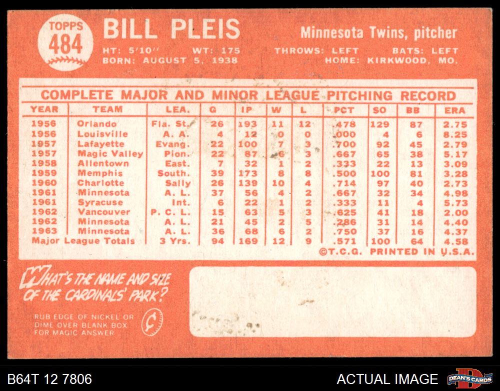 1964 Topps #484 Bill Pleis