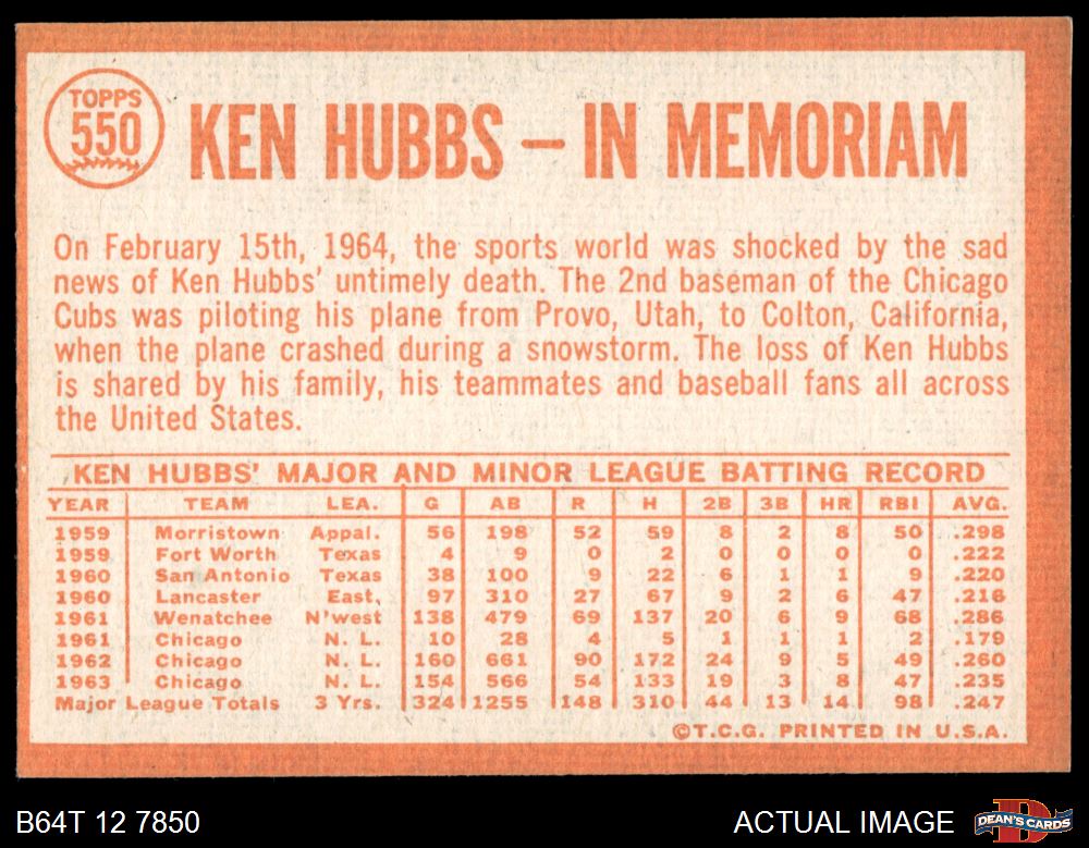 1964 Topps #550 - Ken Hubbs In Memoriam 5.5 - EX+