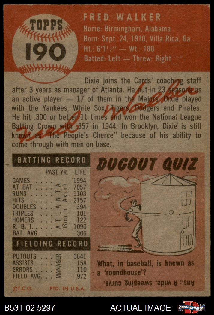 1953 Topps #190 Dixie Walker 6 - EX/MT