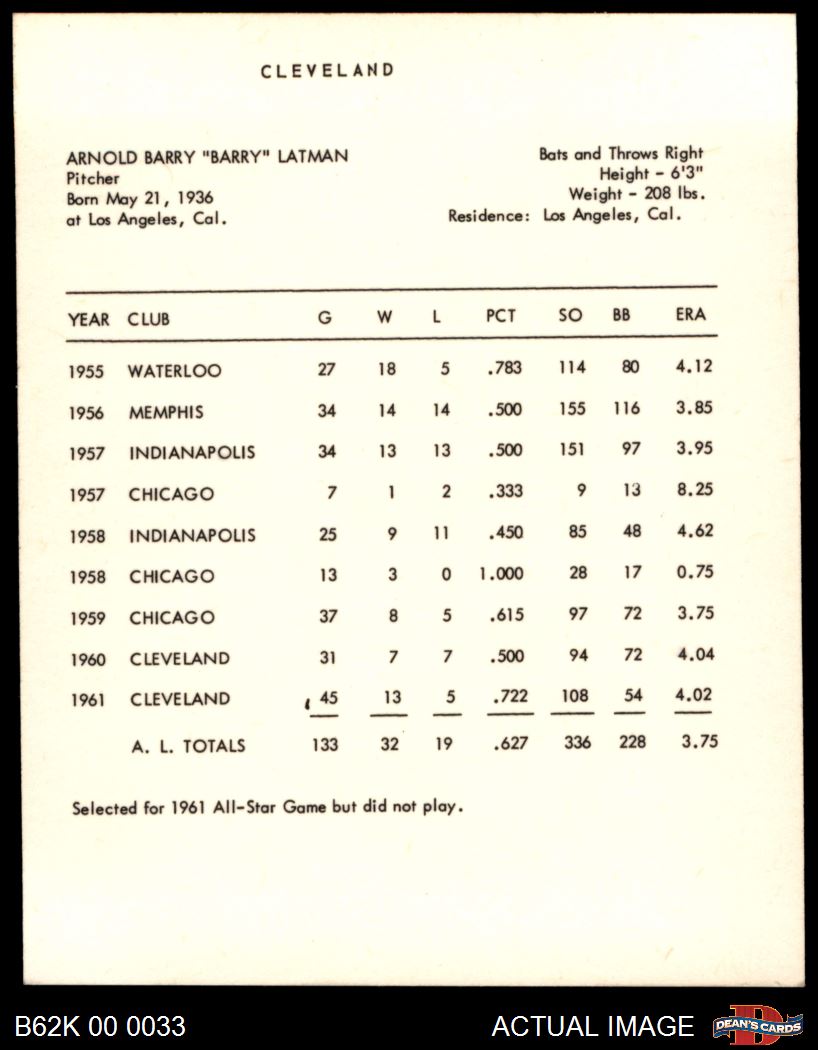 1962 Kahn's Barry Latman 8 - NM/MT