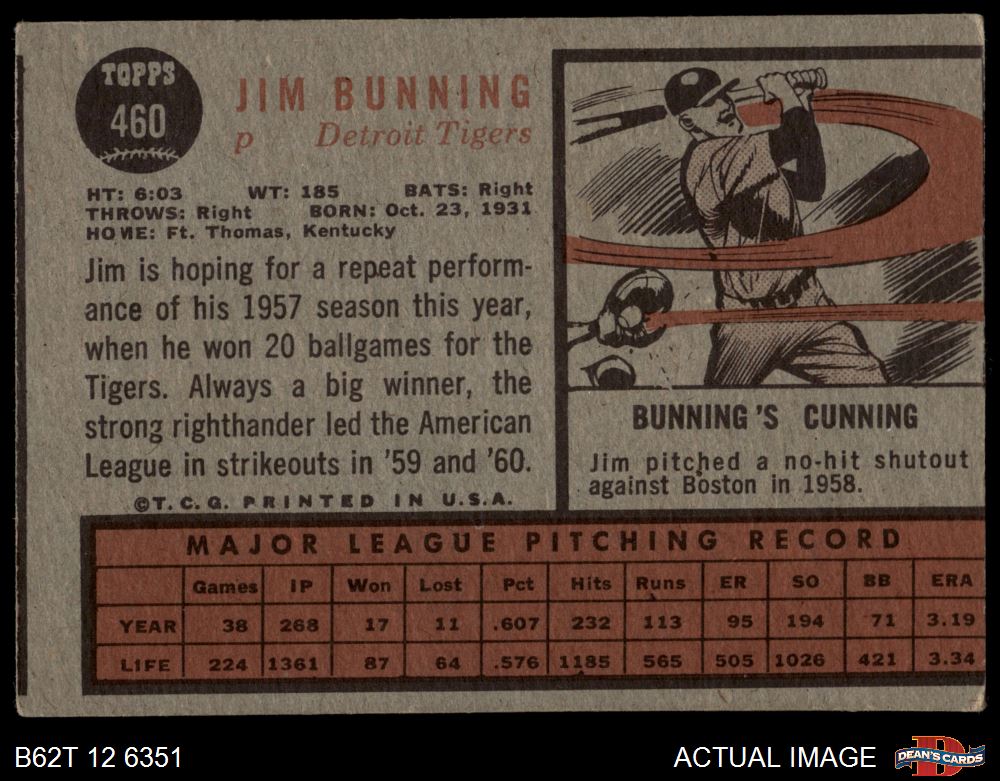 1962 Topps #460 Jim Bunning 1.5 - FAIR