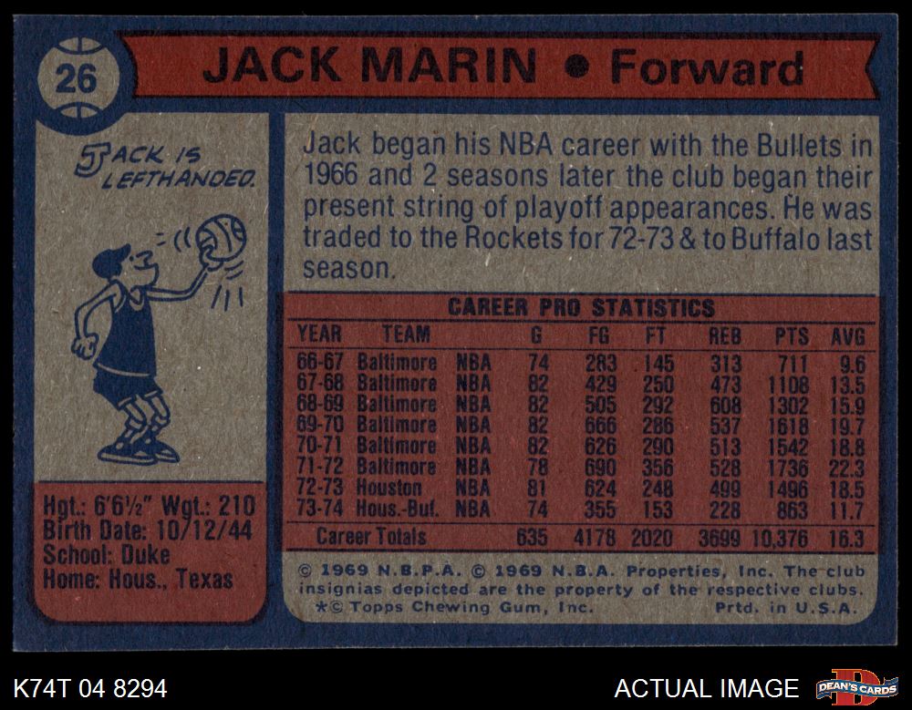 1974 Topps #26 Jack Marin 6 - EX/MT
