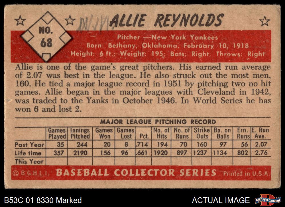 1953 Bowman #68 Allie Reynolds 1 - POOR