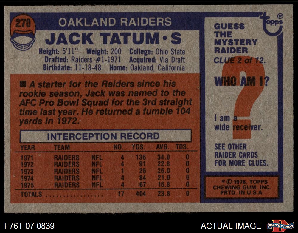 1976 Topps #270 Jack Tatum 6 - EX/MT