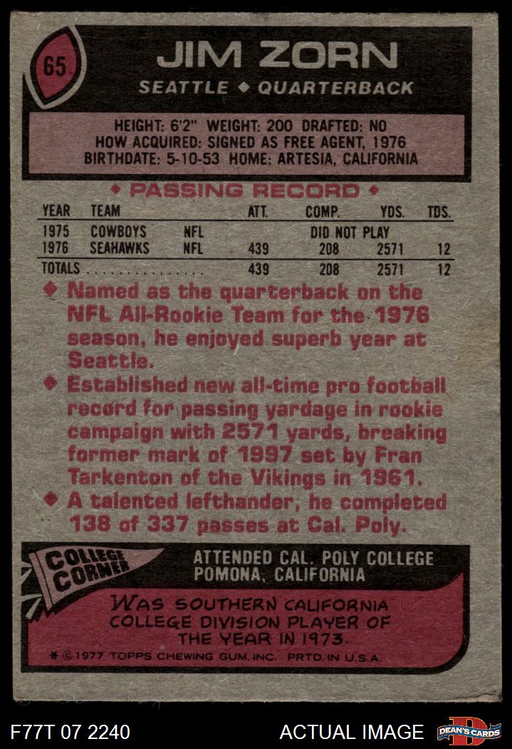 1977 Topps #65 Jim Zorn 2 - GOOD