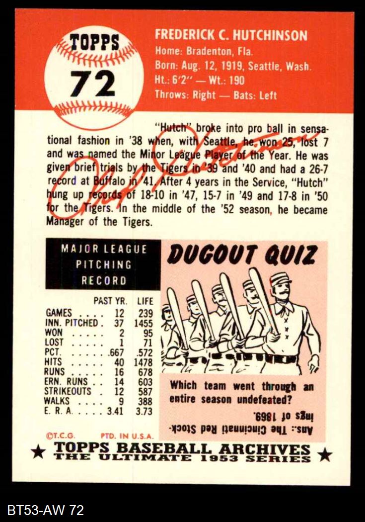 1953 Topps Archives #72 Fred Hutchinson 8 - NM/MT
