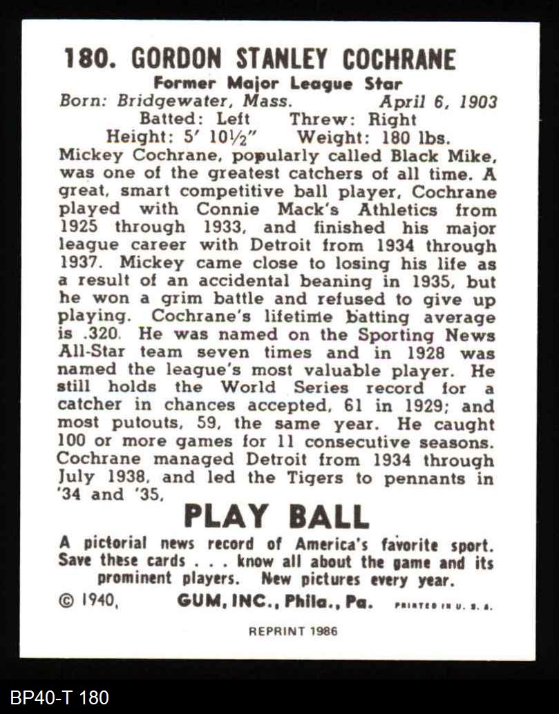 1940 Play Ball Reprint #180 Mickey Cochrane