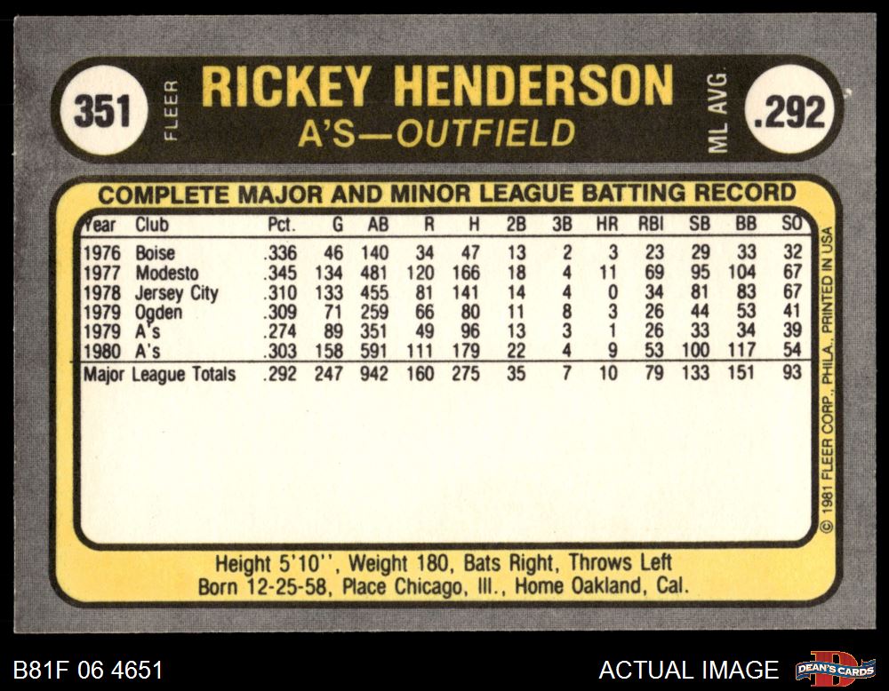 1981 Fleer #351 - Rickey Henderson MOST STOLEN BASES AL 8 - NM/MT