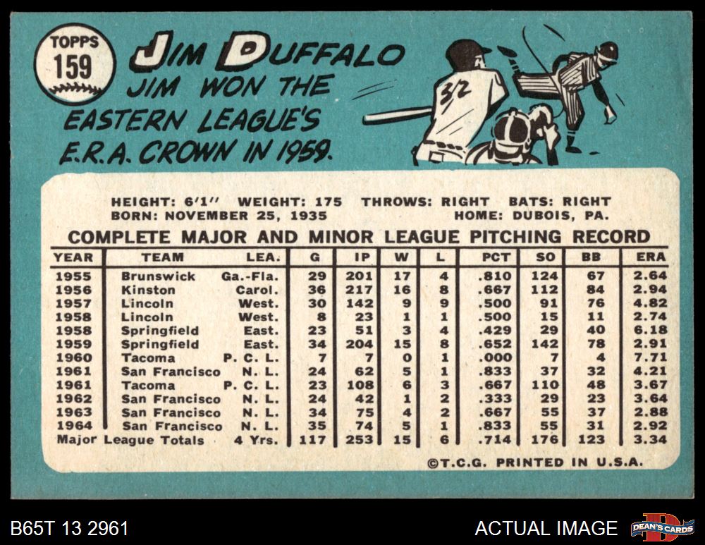 1965 Topps #159 Jim Duffalo 6 - EX/MT