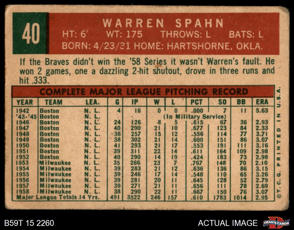 1959 Topps #40 OBS Warren Spahn 1 - POOR