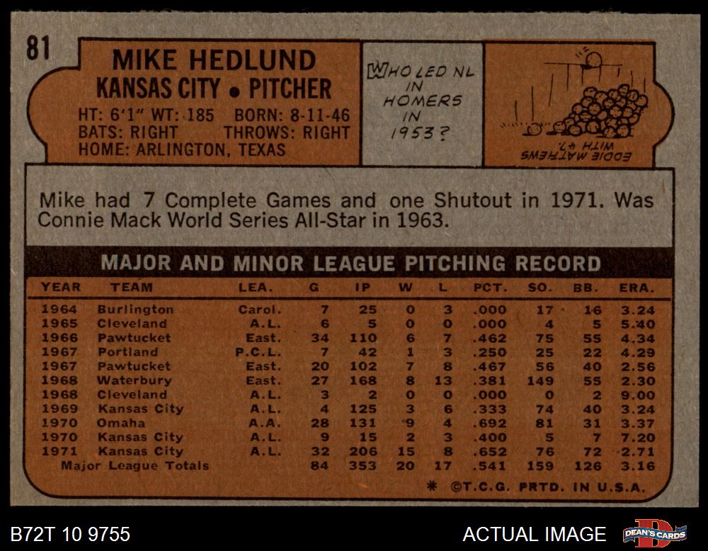 1972 Topps #81 Mike Hedlund 5 - EX