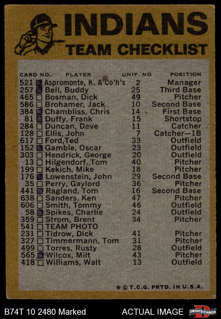 1974 Topps Cleveland Indians Red Team Checklist 1 - POOR