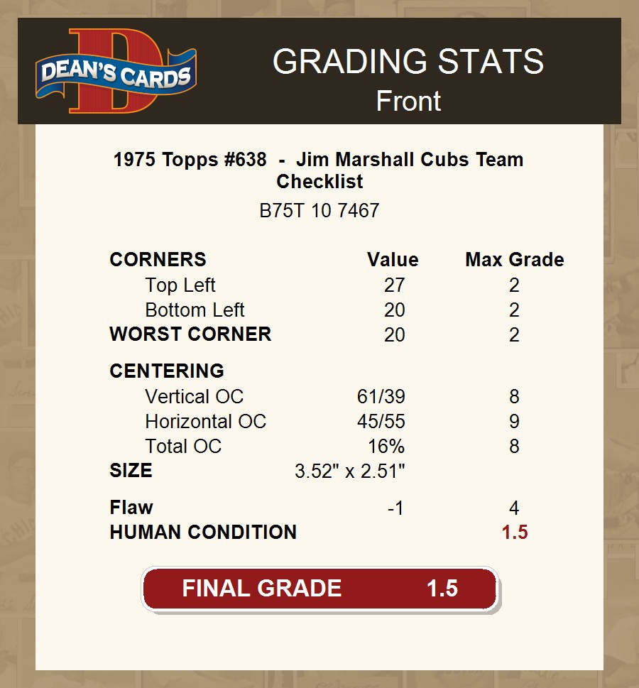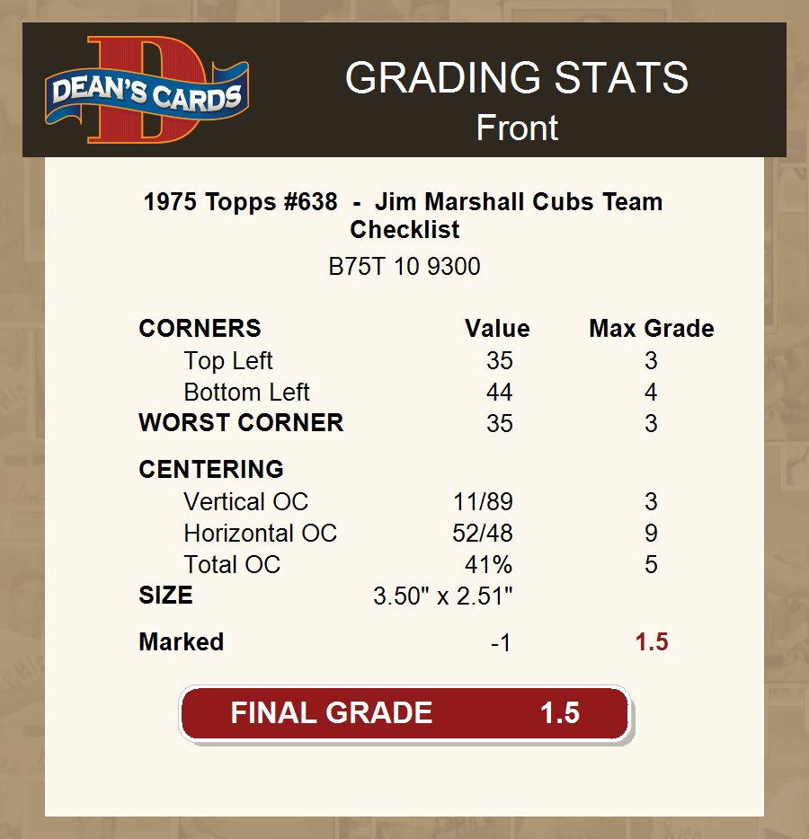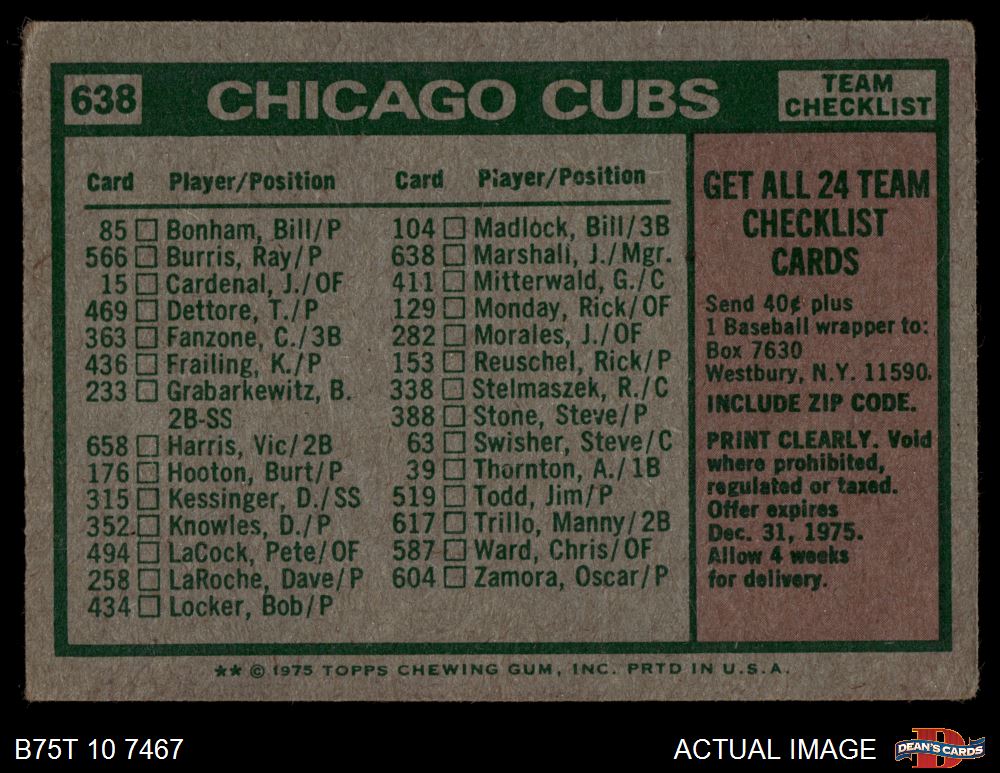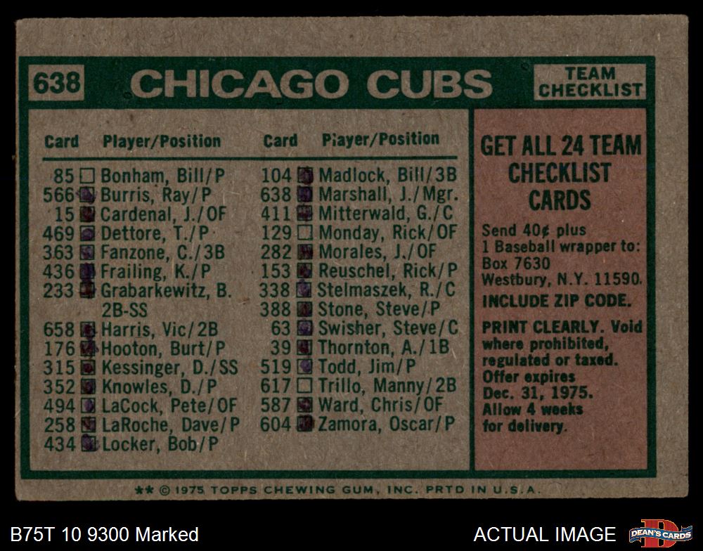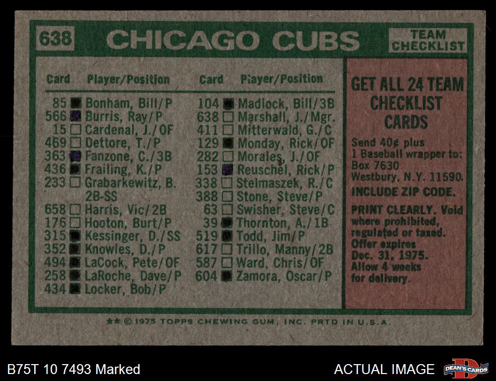 1975 Topps #638 - Jim Marshall Cubs Team Checklist 1.5 - FAIR