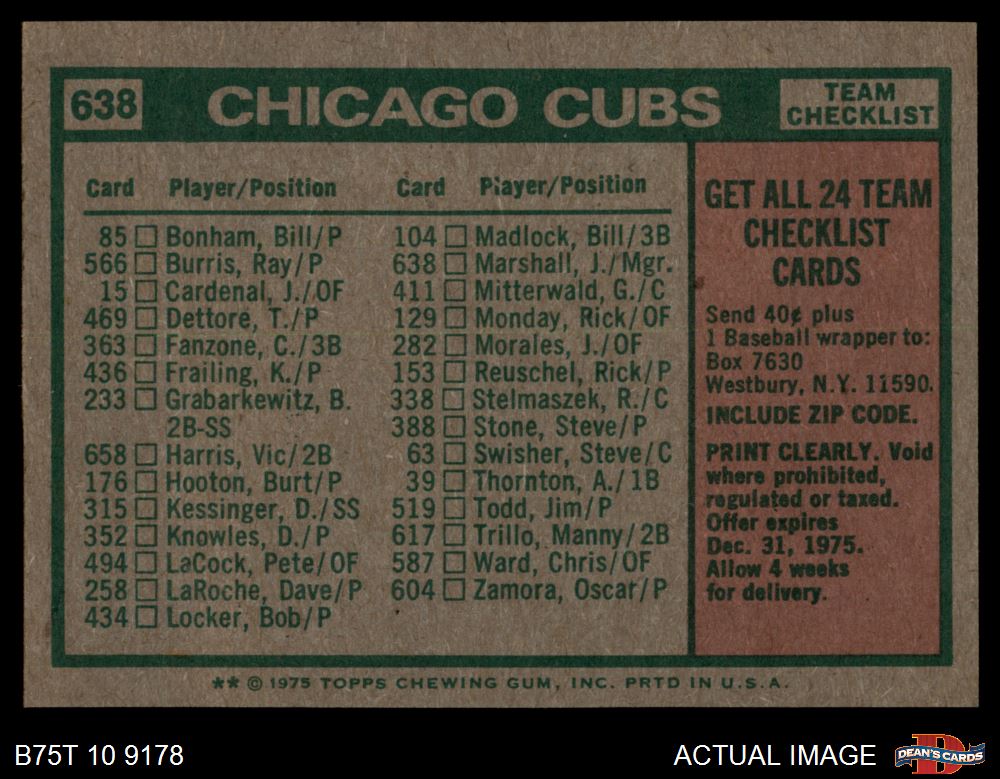 1975 Topps #638 - Jim Marshall Cubs Team Checklist 6 - EX/MT