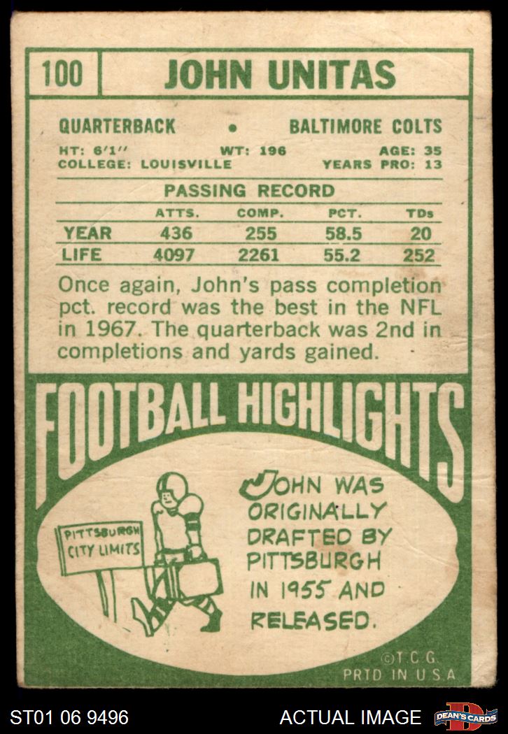 1968 Topps #100 Johnny Unitas AUTHENTIC