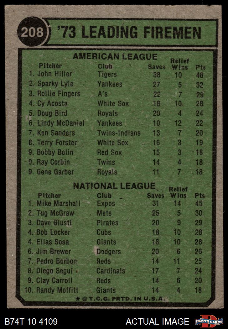 1974 Topps #208 - John Hiller / Mike Marshall Leading Firemen 3 - VG