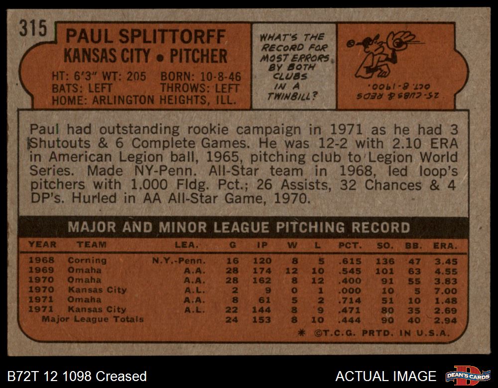 1972 Topps #315 Paul Splittorff 3 - VG