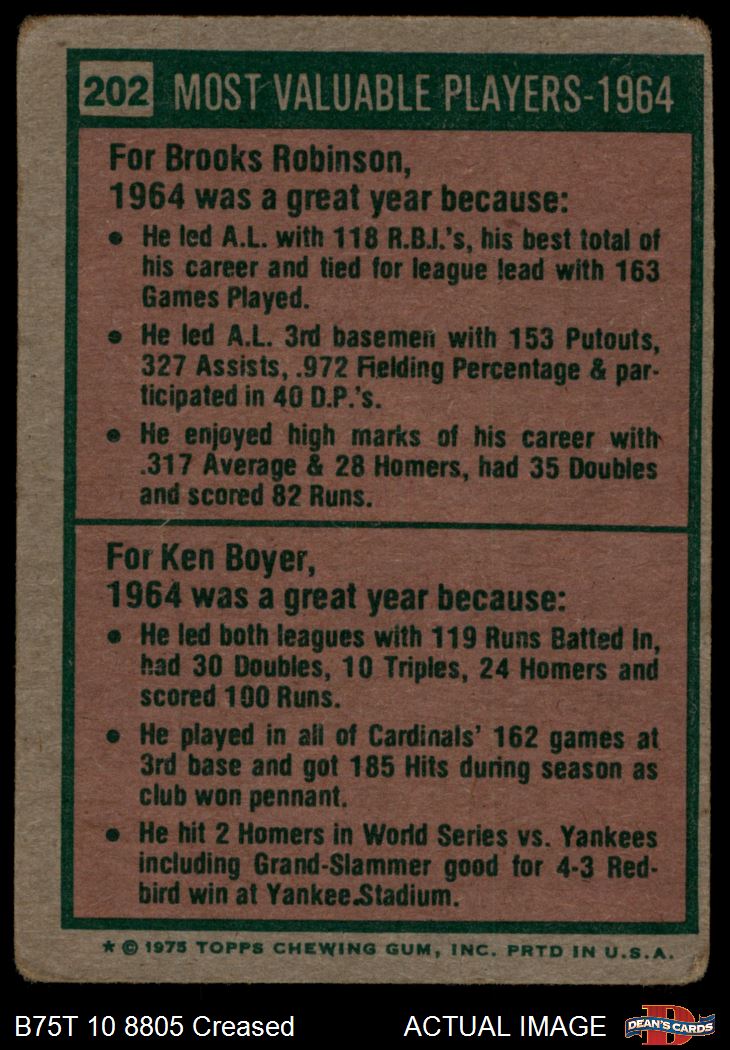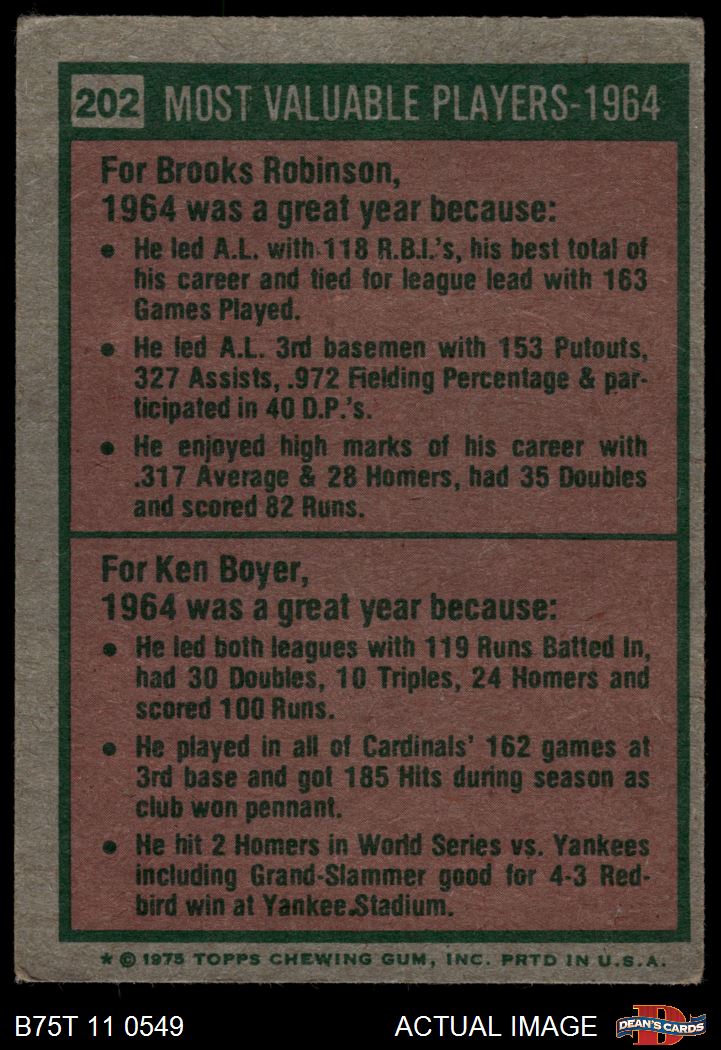 1975 Topps #202 - Brooks Robinson / Ken Boyer 1964 MVPs 2 - GOOD