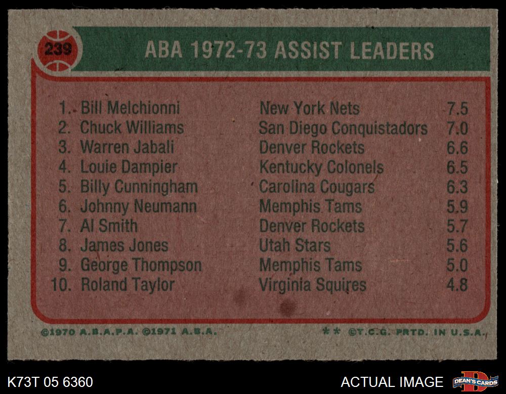 1973 Topps #239 - Bill Melchionni / Chuck Williams / Warren Jabali ABA Assists Leaders 5 - EX