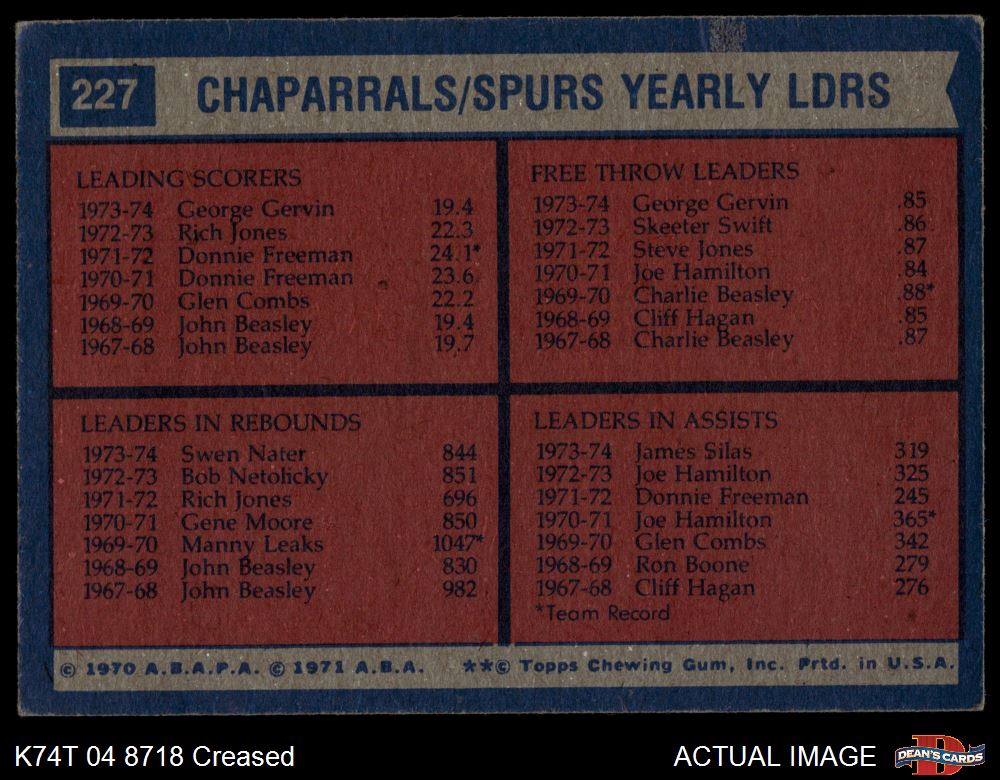 1974 Topps #227 - James Silas / Swen Nater / George Gervin Spurs Leaders 2 - GOOD