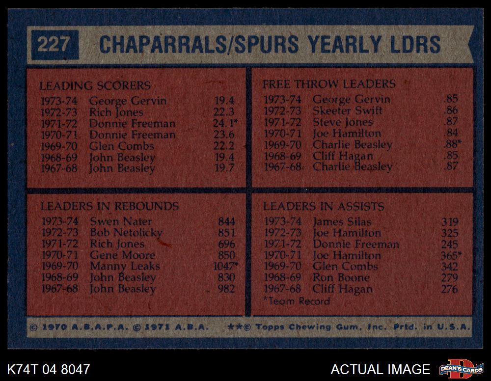 1974 1974 #227 - James Silas / Swen Nater / George Gervin Spurs Leaders 8 - NM/MT