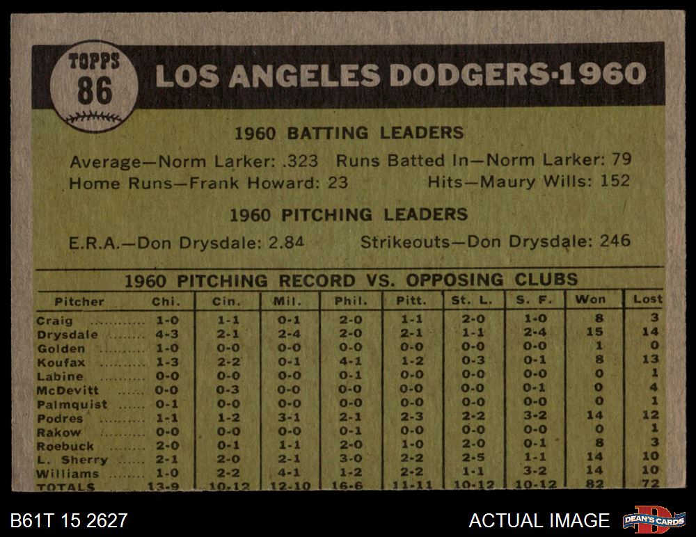 1961 Topps #86 Dodgers Team 3 - VG
