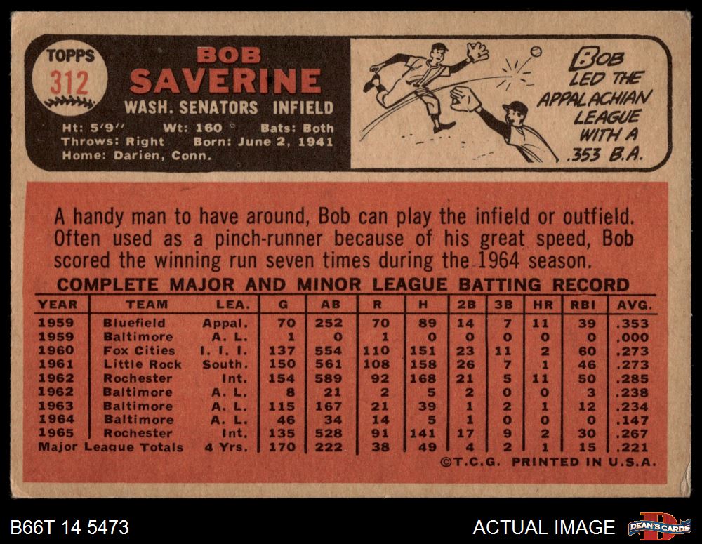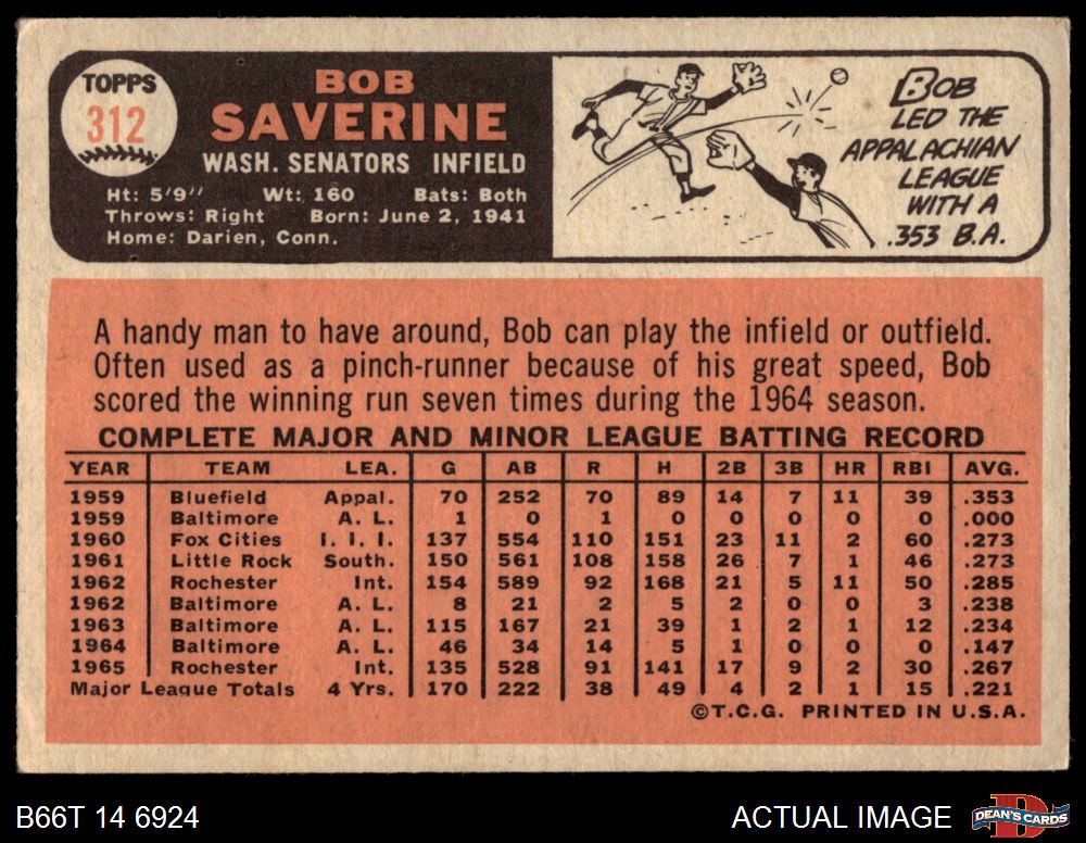 1966 Topps #312 Bob Saverine 3 - VG
