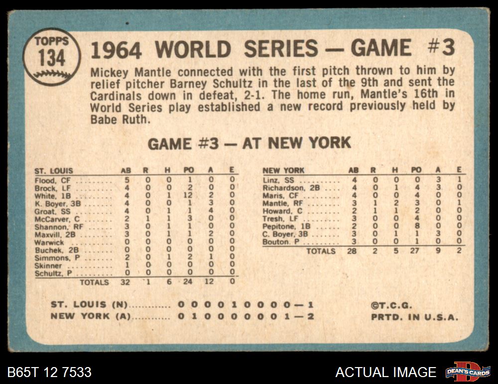 1965 Topps #134 - Mickey Mantle 1964 World Series - Game #3 - Mantle's Clutch HR 2 - GOOD