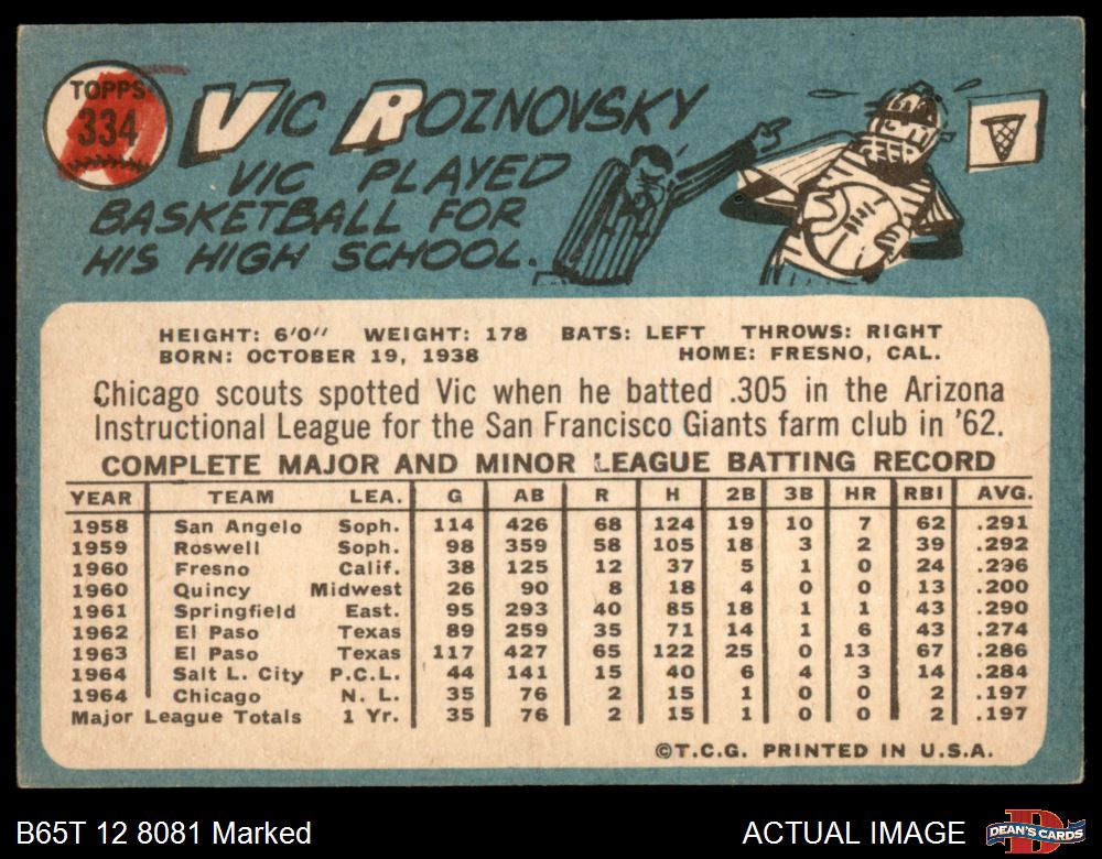 1965 Topps #334 Vic Roznovsky 1.5 - FAIR