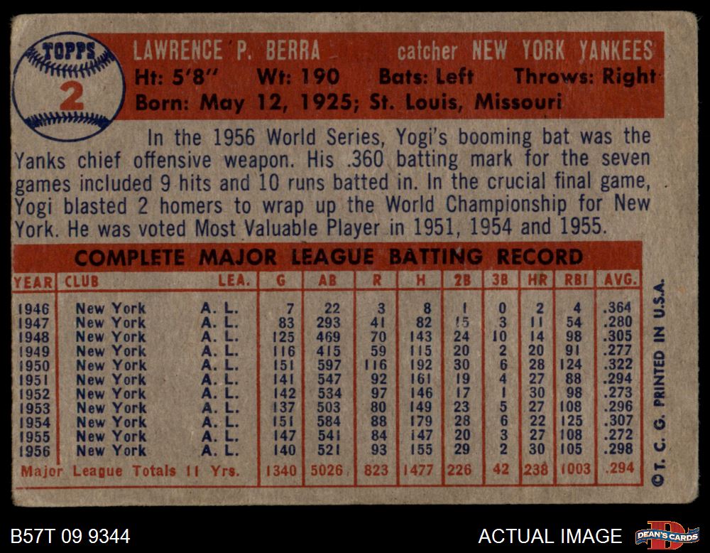 1957 Topps #2 Yogi Berra 1 - POOR