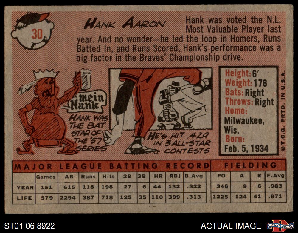 1958 Topps #30 WN Hank Aaron 3.5 - VG+
