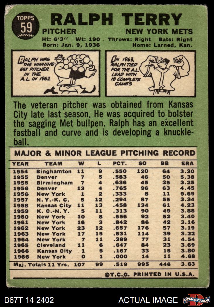 1967 Topps #59 Ralph Terry 2 - GOOD