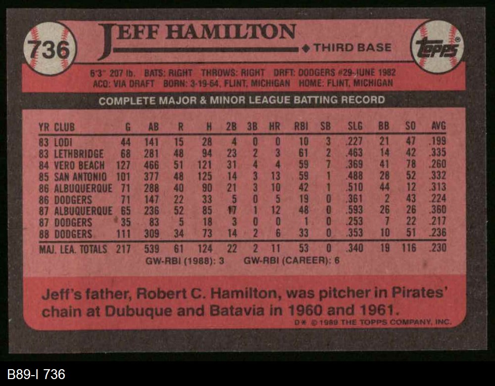1989 Topps #736 Jeff Hamilton 8 - NM/MT