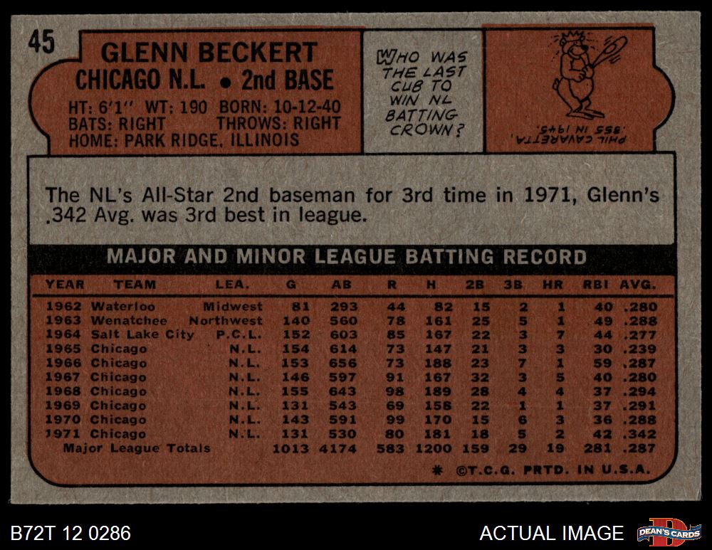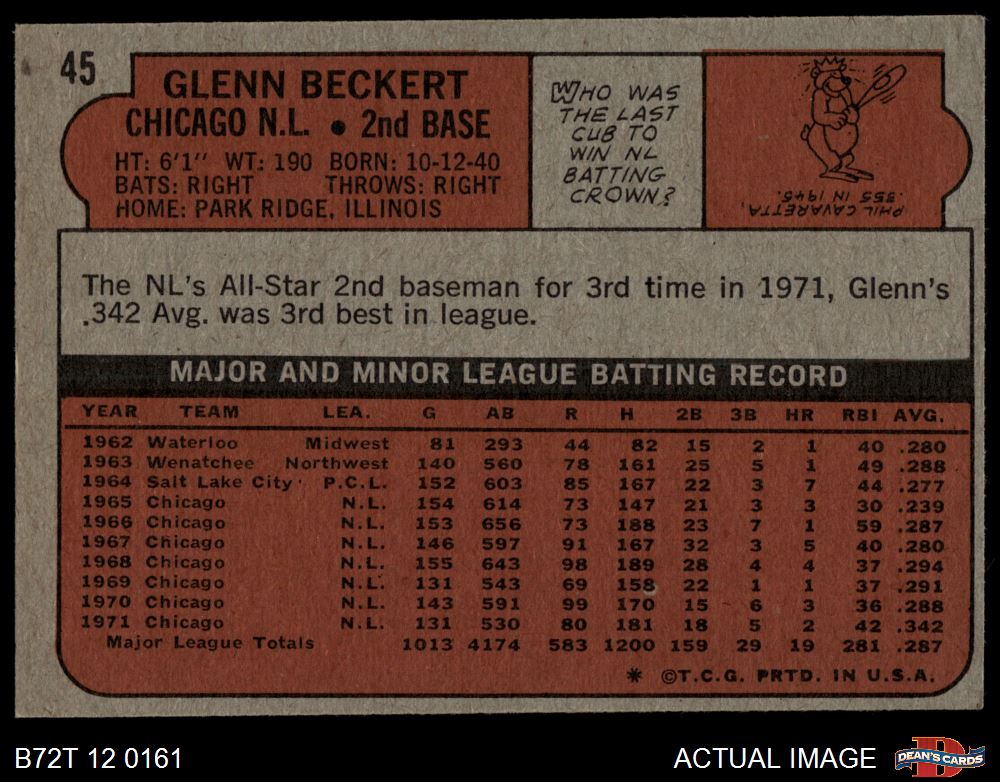 1972 Topps #45 YLW Glenn Beckert 4 - VG/EX