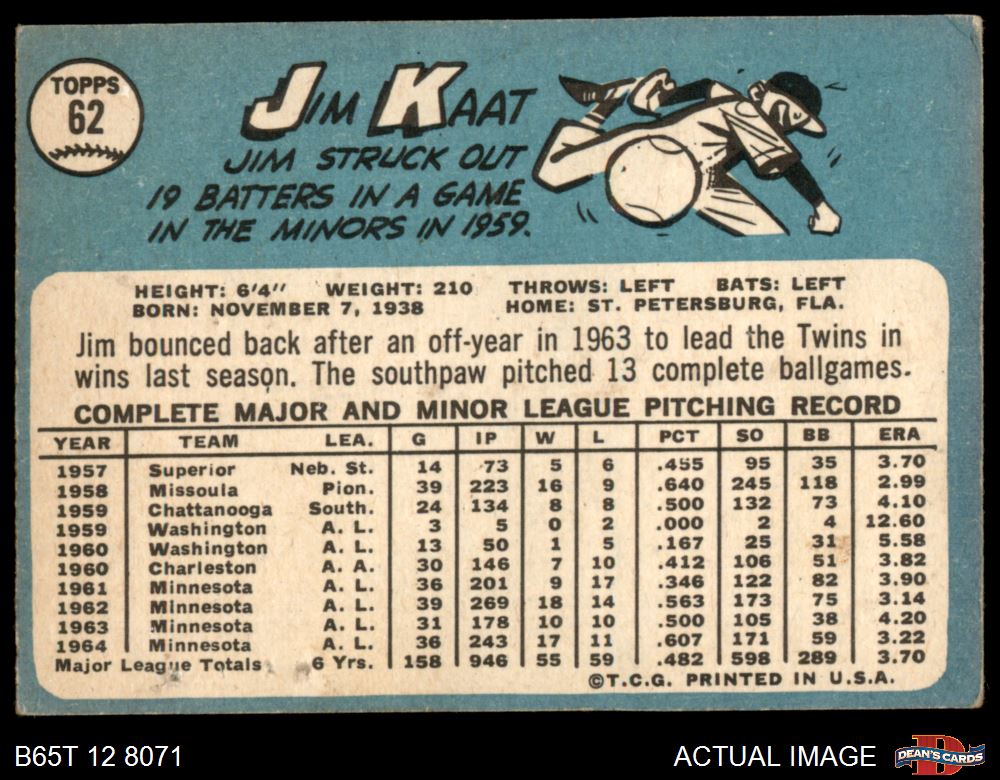 1965 Topps #62 Jim Kaat 1 - POOR