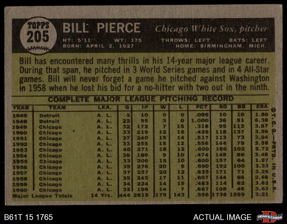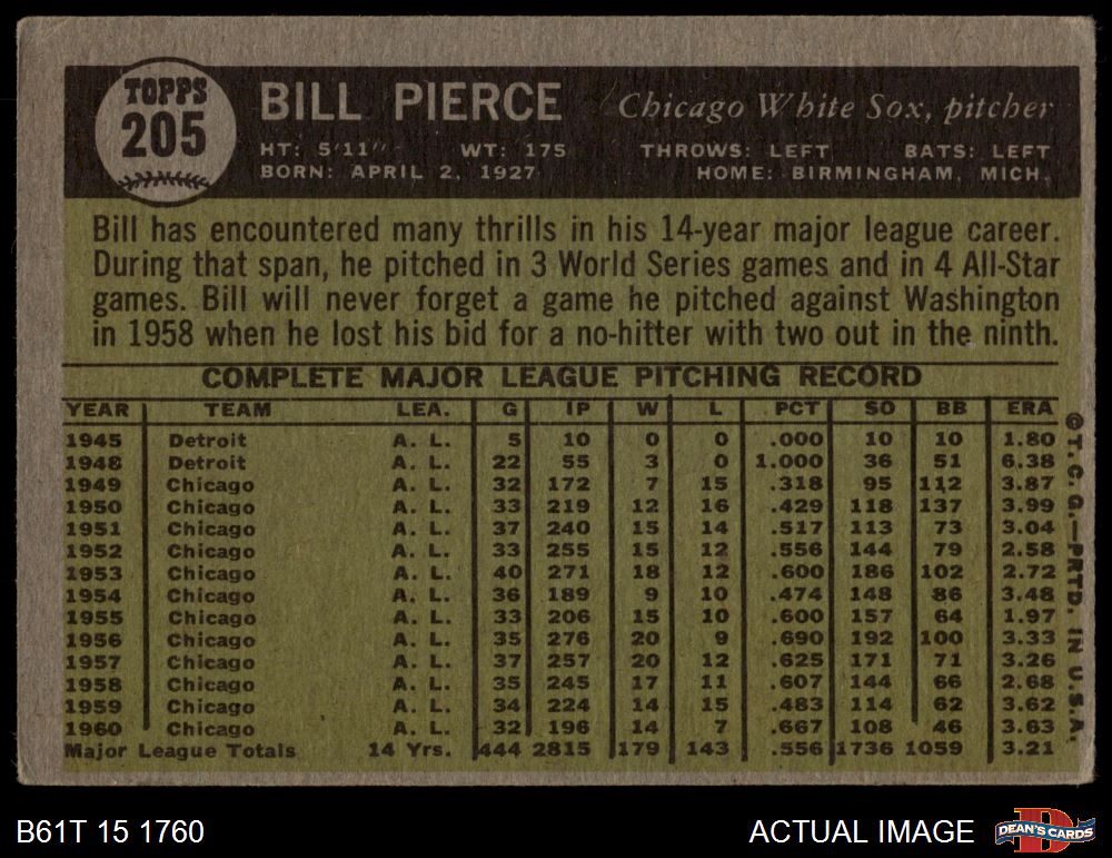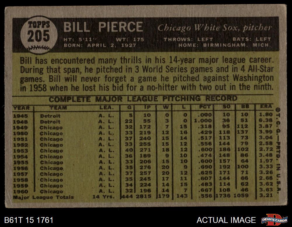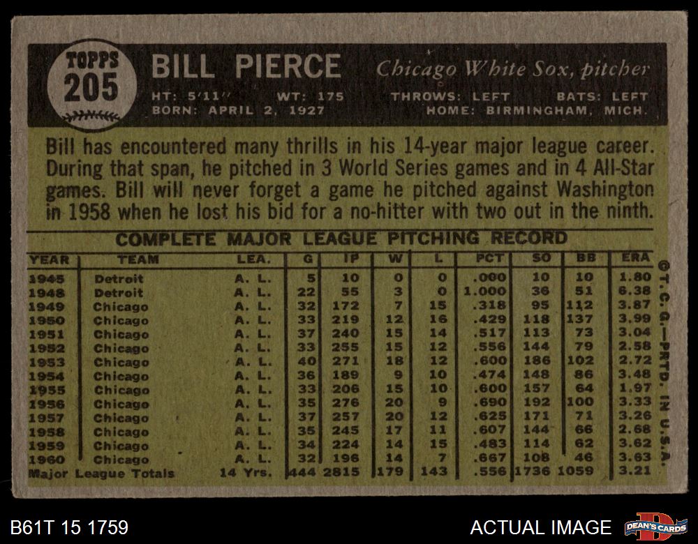 1961 Topps #205 Bill Pierce