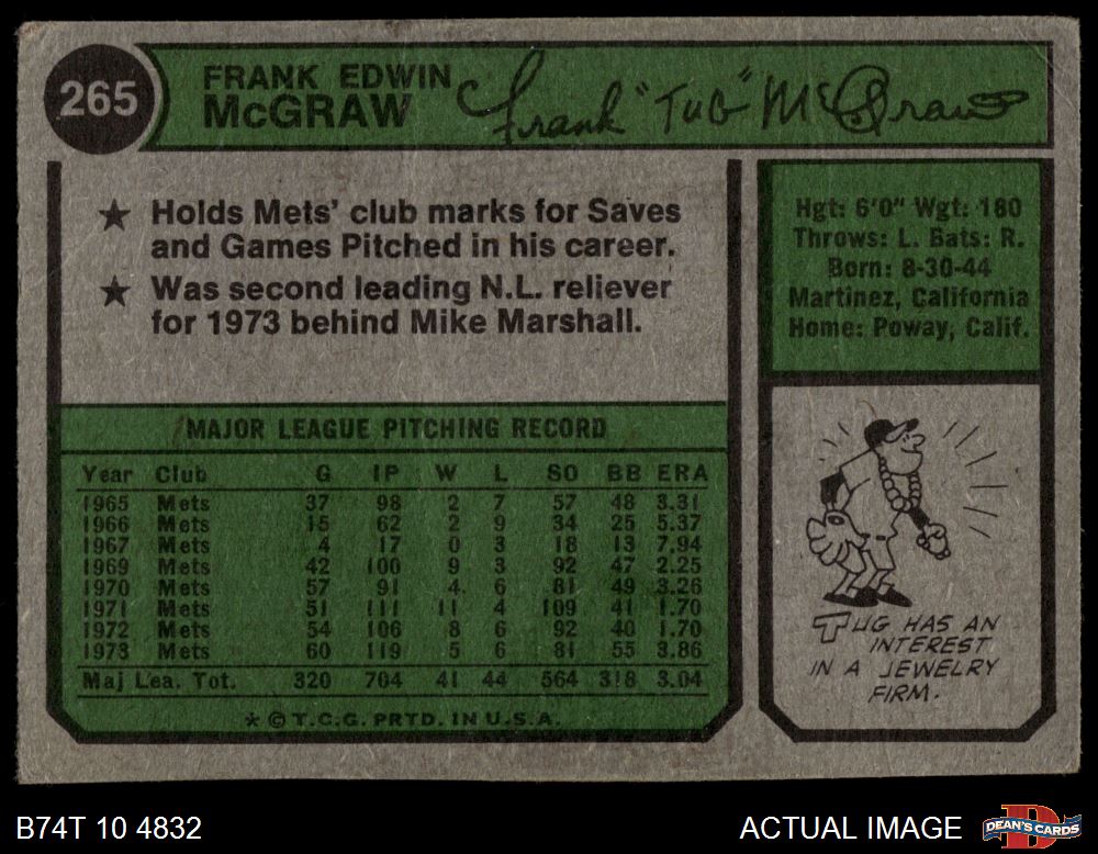 1974 Topps #265 Tug McGraw 1 - POOR