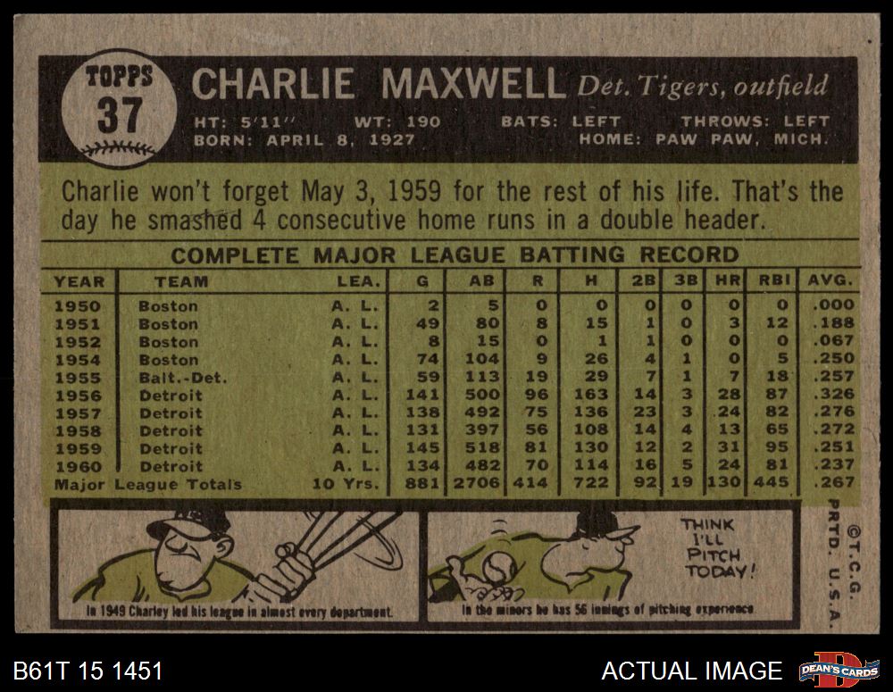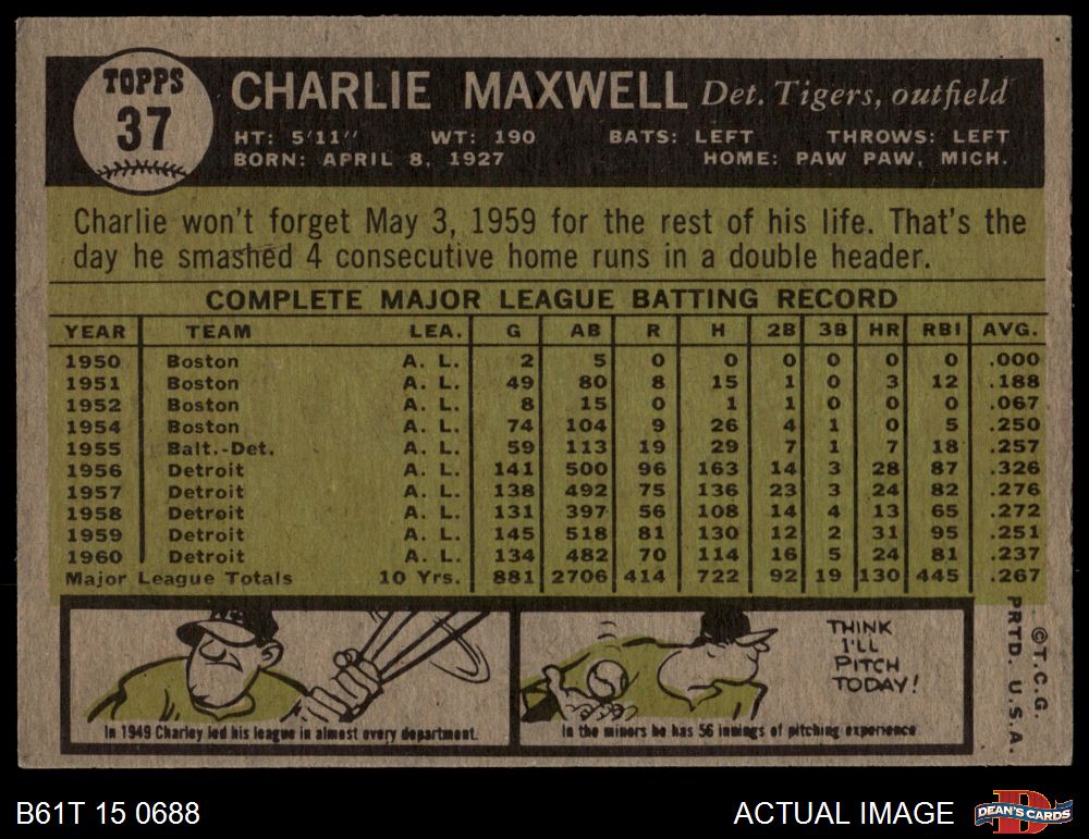 1961 Topps #37 Charlie Maxwell 4 - VG/EX