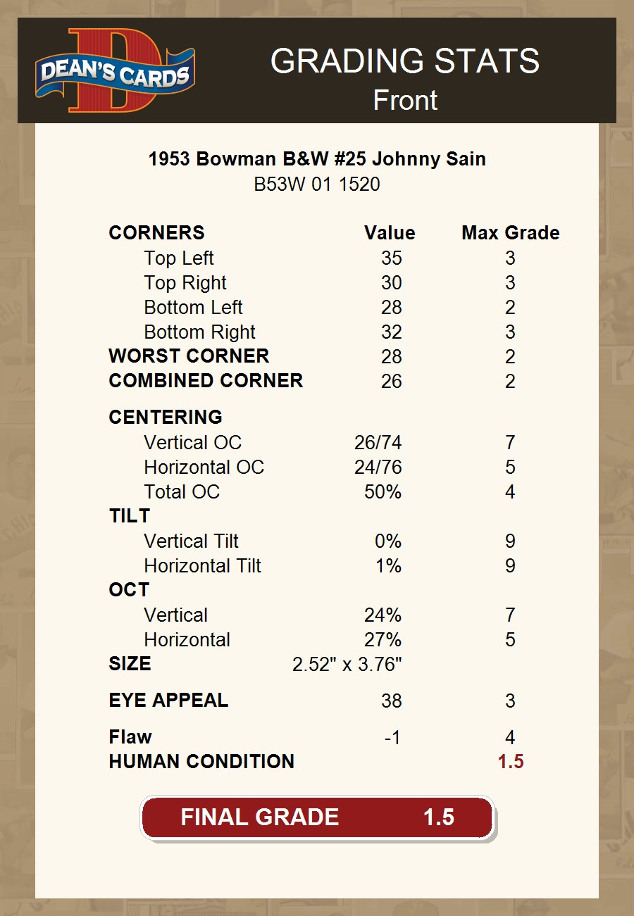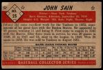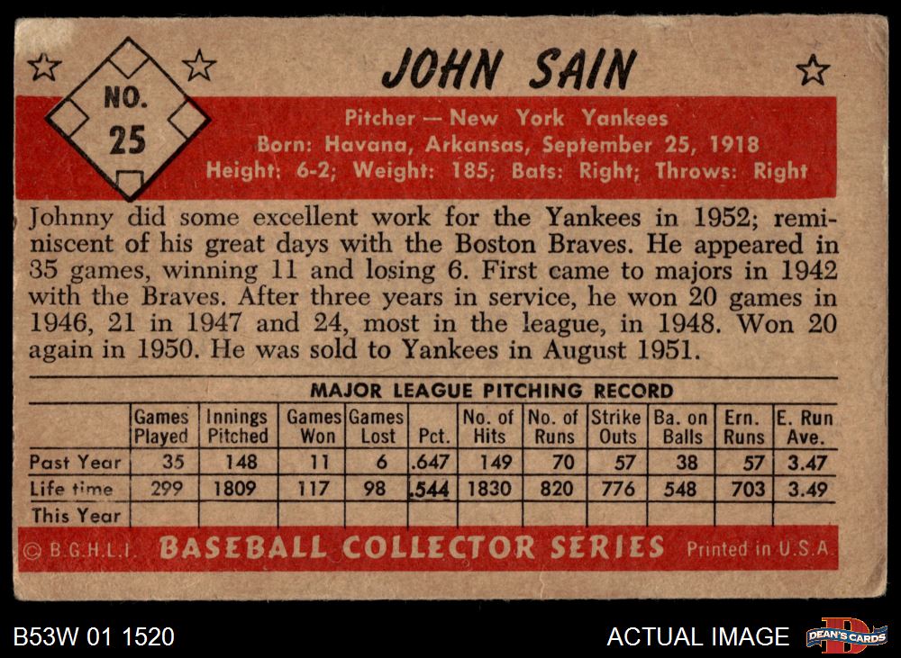 1953 Bowman B&W #25 Johnny Sain 1.5 - FAIR