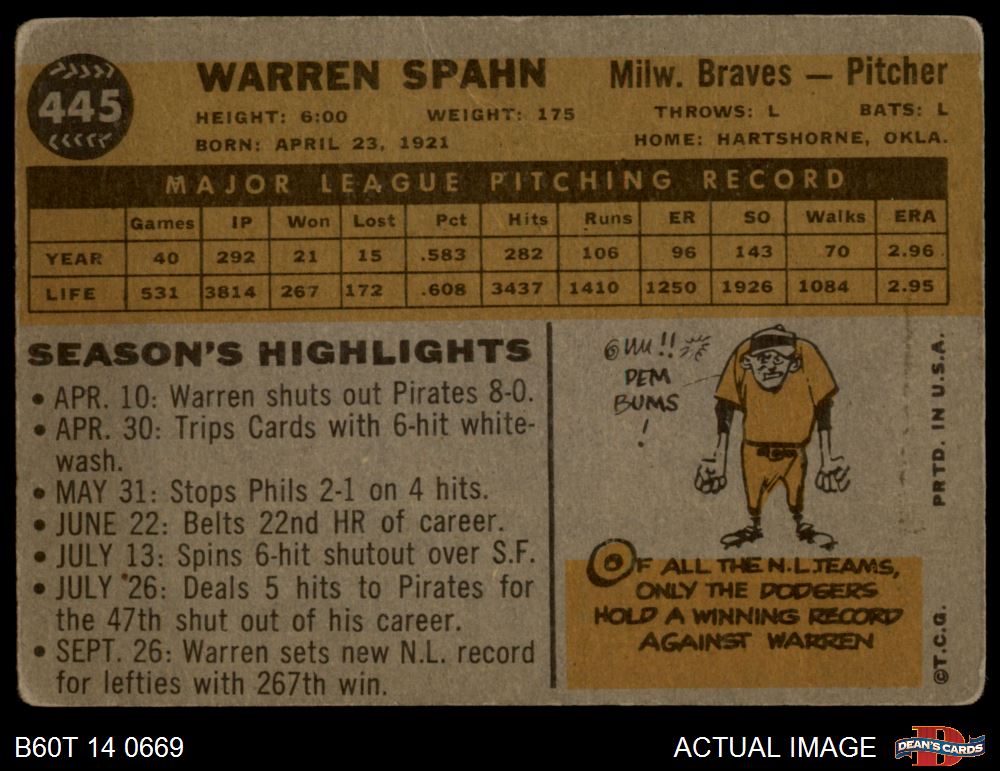 1960 Topps #445 Warren Spahn 1 - POOR